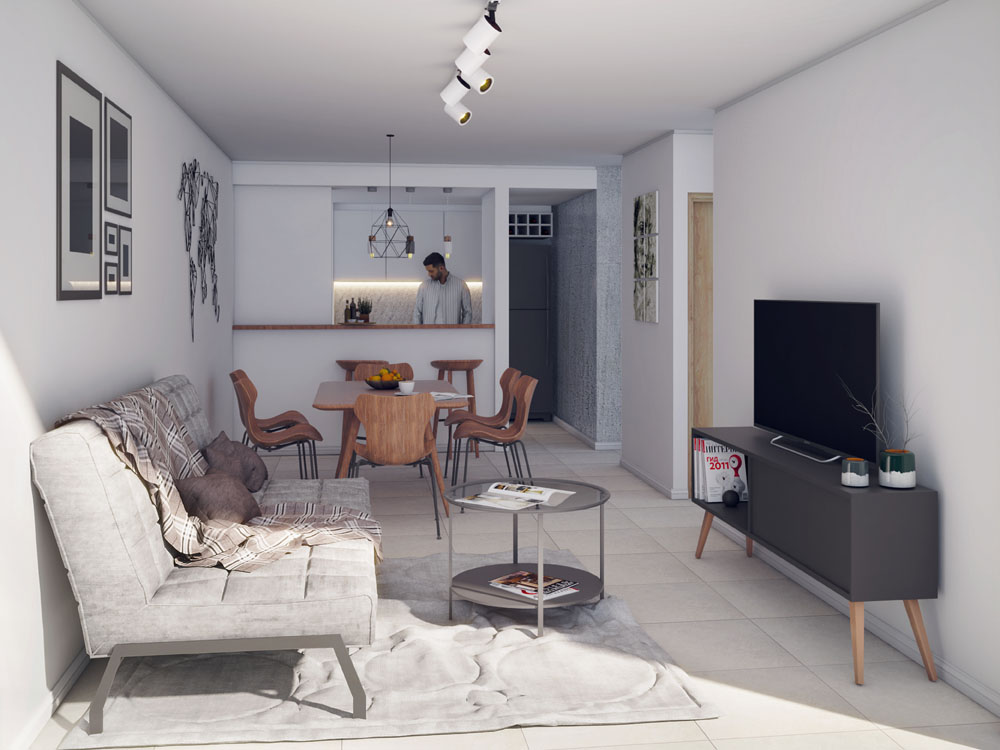 Se plantean 30 departamentos de 1 dormitorio, todos los ambientes al frente, amplios, todos con cocina con espacio para lavarropas, y grandes baños. Todos los departamentos uentan con balcón corrido a espacio verde.